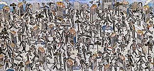 Η επιμελήτρια της έκθεσης Μάρθα Χαλικιά επισημαίνει στο κείμενο του καταλόγου: «οι σκηνές που διαδραματίζονται σε αυτό το πολυεθνικό αστικό παζλ, εντάσσονται σε μια ευρύτερη προσπάθεια δημιουργίας ενός νέου τοπίου σύμφωνα με τα δεδομένα της εποχής. Σε αυτές τις σκηνές, χτίζεται και δραματοποιείται η σύγχρονη εικόνα του λαβυρίνθου, των πολλαπλών κατευθύνσεων, όπου το καθετί είναι σχετικό και μοιάζει να αποτελεί μέρος ενός παράξενου παιχνιδιού που κινείται μεταξύ τρέλας και πόνου. Το φανταστικό στοιχείο διαφαίνεται σε εικόνες που έχουν τη γοητεία των παραμυθιών αποκαλύπτοντας ταυτόχρονα μία έκδηλη απογοήτευση, αποτέλεσμα της κριτικής προσέγγισης των ενηλίκων».